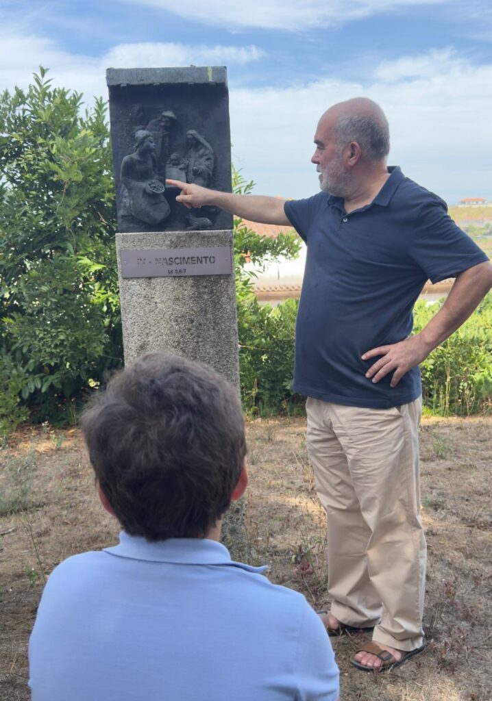 Em pós esta, conduzidos pelo Frei João e pelas perguntas e espantos da Luisinha e do Lucas, subimos calmamente o Monte dos Mistérios (do Menino Jesus). Valeu a pena, porque ninguém foi de alma pequena – além de ter sido uma delícia ver como o par de petizes belamente decifrou, umaa uma, as personagens das diversas gravuras. Inolvidável!